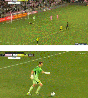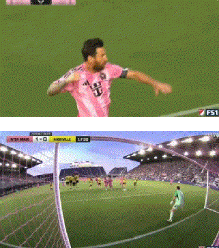 第一球,发生在上半场第17分钟,当时迈阿密国际队获得了前场中路大禁区外的一个任意球机会,梅西操刀主罚,直接把任意球当点球踢,轰出无解贴地斩轰开了对手的大门。